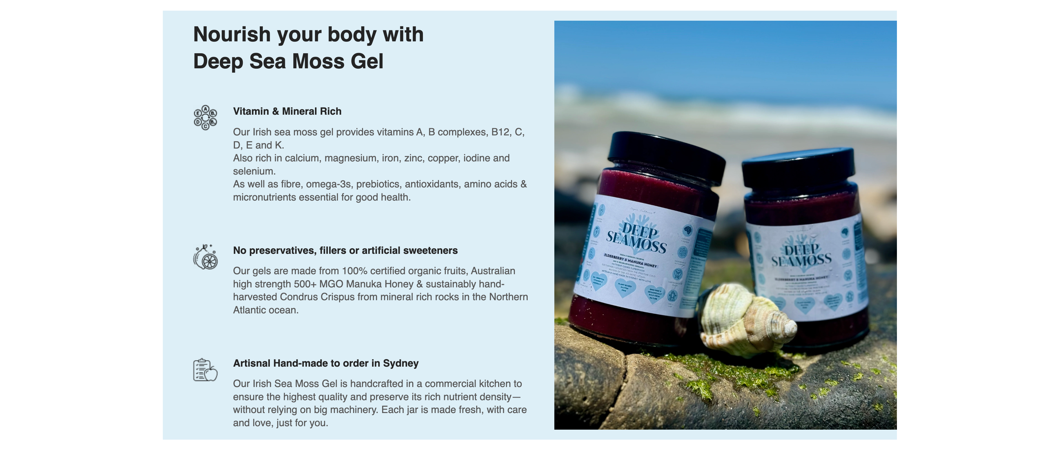 The vitamins and minerals in sea moss, along with its moisturising properties, can improve skin hydration, elasticity, and overall appearance. It is often used in skincare products to treat conditions like eczema and psoriasis.